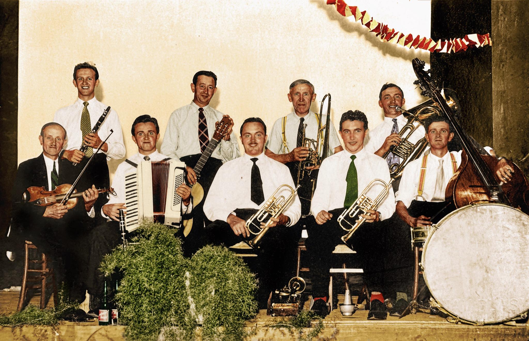 Foto: Kapelle Schönfeldinger (1. Reihe: Karl Schönfeldinger, Herbert Schönfeldinger, Hans Baldauf, Wilhelm Schönfeldinger, Sepp Schönfeldinger; 2. Reihe: Gerhard Schönfeldinger, Albert Klein, Johann Schönfeldinger, N.N.), überliefert, koloriert von Mario Unger