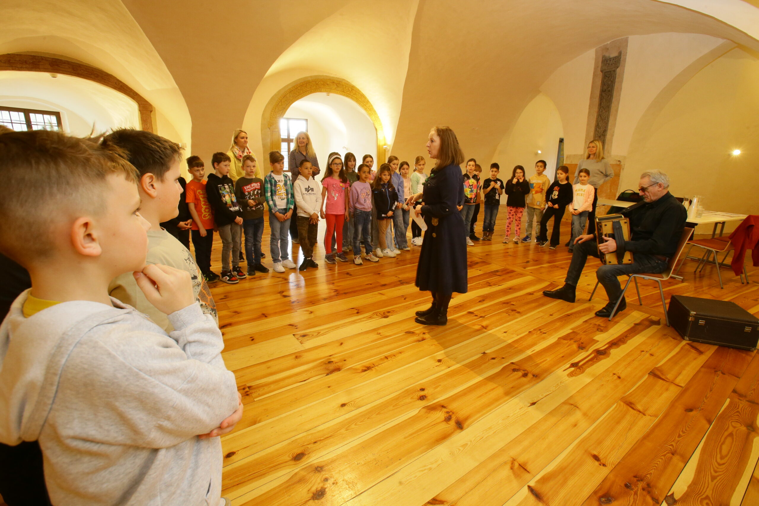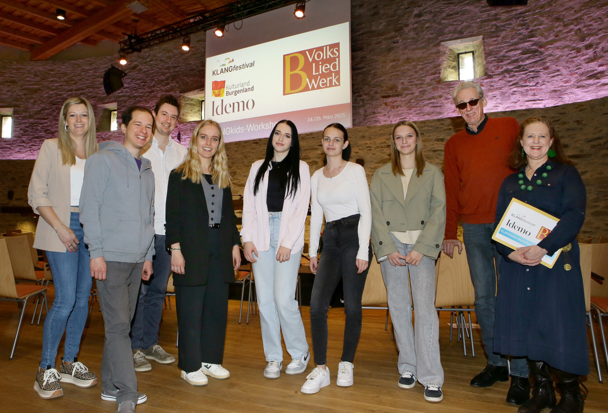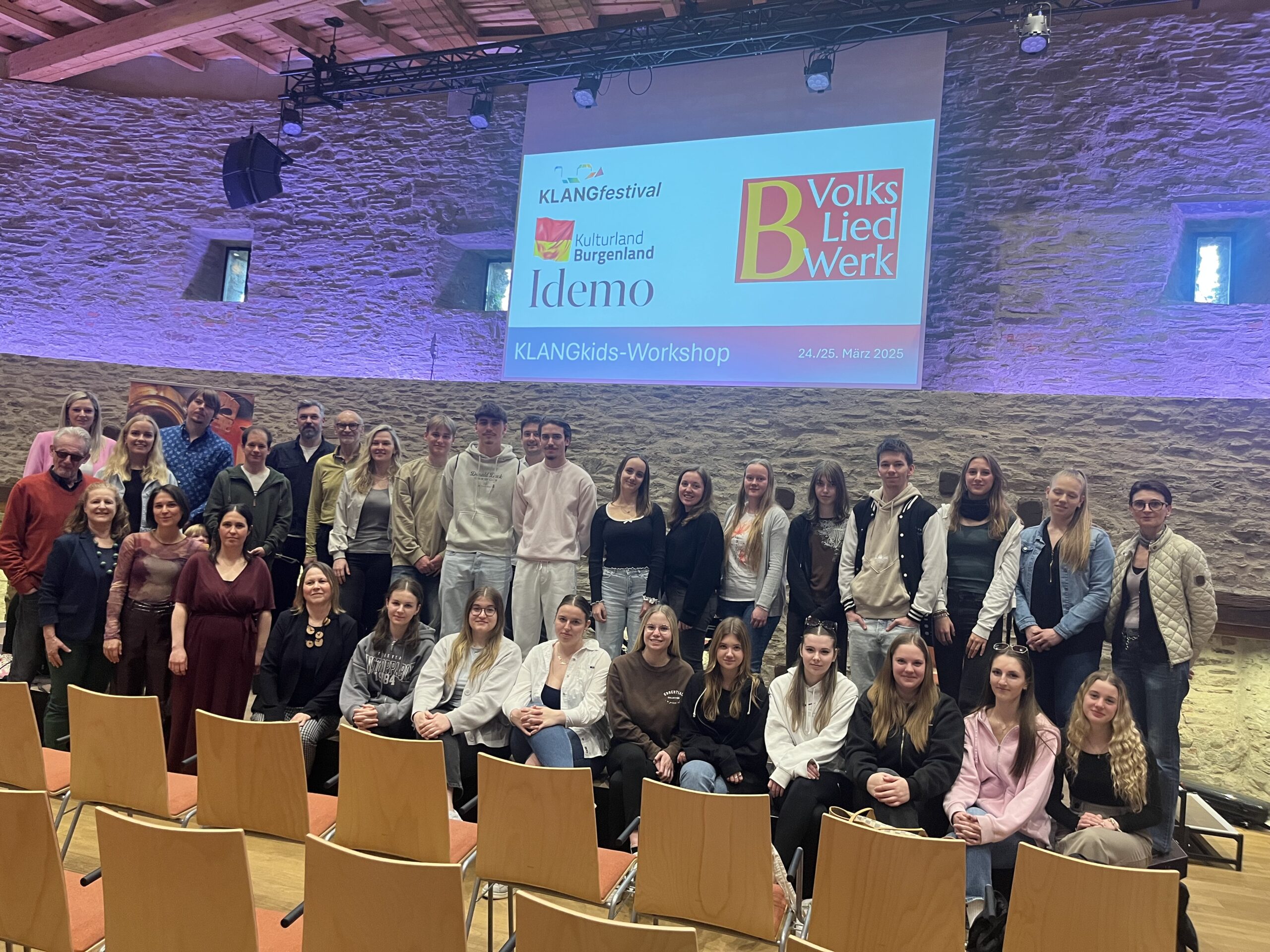 Das Burgenländische Volksliedwerk ist seit vielen Jahren Kooperationspartner des Klangfestivals und organisiert jährlich KLANGkids-Workshops für Volksschulen aus dem Burgenland. Das heurige Klangfestival stand unter dem Motto „Träume“ – ein Thema, das eine unendliche Quelle der Inspiration für Musik, Gesang und Tanz bietet. Am 24. und 25. März 2025 waren insgesamt neun burgenländische Volksschulen auf der Friedensburg Schlaining zu Gast, um in deren historischen Räumlichkeiten dieses Thema gemeinsam musikalisch zu entdecken: die Volksschulen Pinkafeld, Stadtschlaining, Weiden bei Rechnitz, Güssing, Bad Tatzmannsdorf, Horitschon, Oberdorf, St. Michael und Deutsch Tschantschendorf. In Summe nahmen an den beiden Workshoptagen rund 420 Kinder mit Begeisterung teil. Unter Anleitung von Referent:innen des Burgenländischen Volksliedwerks sowie Schüler:innen der BAfEP Oberwart wurden Volkslieder und Jodler einstudiert, wobei das gemeinsame freudvolle Erleben von Musik im Vordergrund stand.