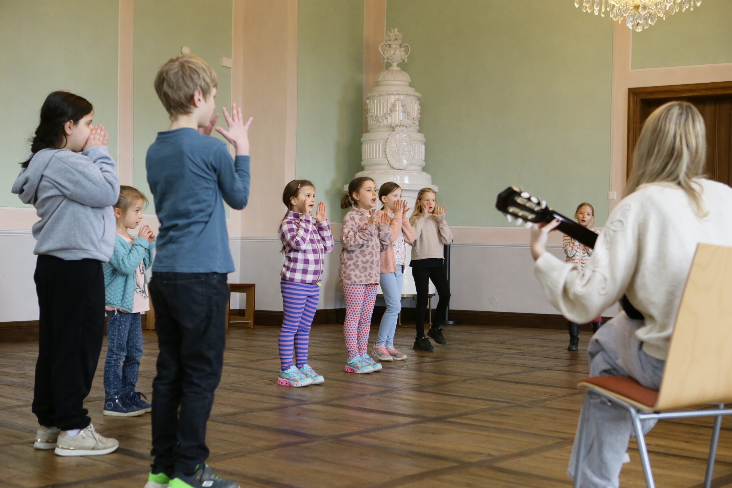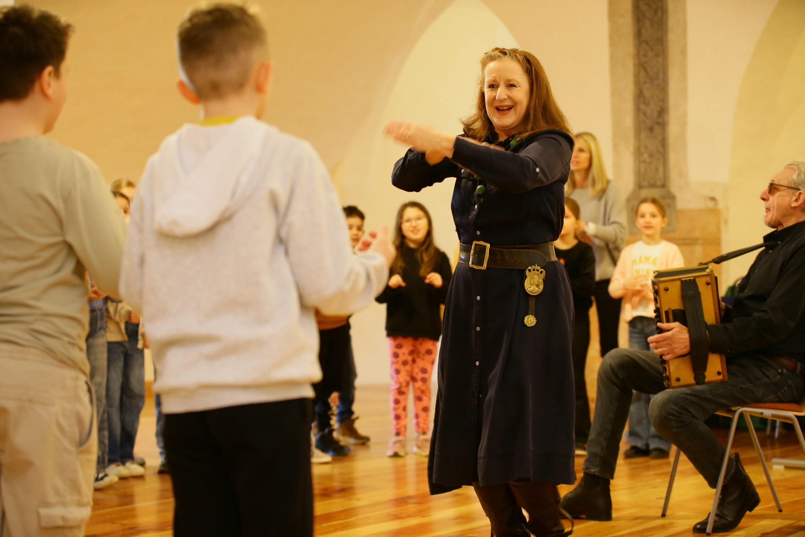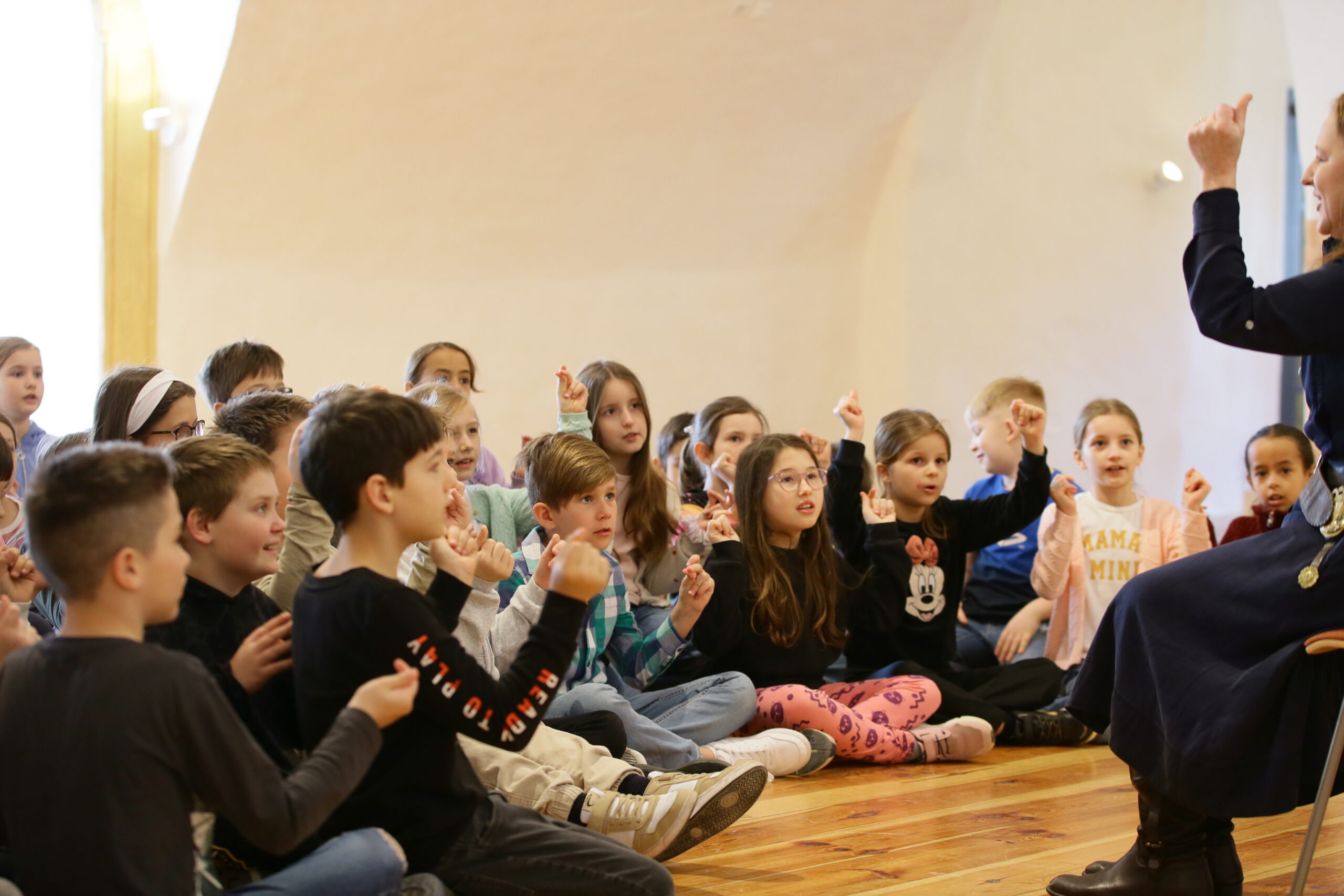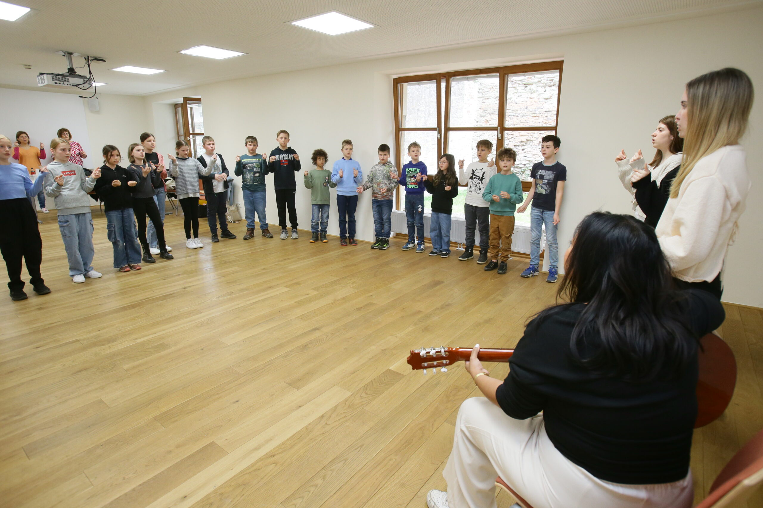 Das Burgenländische Volksliedwerk ist seit vielen Jahren Kooperationspartner des Klangfestivals und organisiert jährlich KLANGkids-Workshops für Volksschulen aus dem Burgenland. Das heurige Klangfestival stand unter dem Motto „Träume“ – ein Thema, das eine unendliche Quelle der Inspiration für Musik, Gesang und Tanz bietet. Am 24. und 25. März 2025 waren insgesamt neun burgenländische Volksschulen auf der Friedensburg Schlaining zu Gast, um in deren historischen Räumlichkeiten dieses Thema gemeinsam musikalisch zu entdecken: die Volksschulen Pinkafeld, Stadtschlaining, Weiden bei Rechnitz, Güssing, Bad Tatzmannsdorf, Horitschon, Oberdorf, St. Michael und Deutsch Tschantschendorf. In Summe nahmen an den beiden Workshoptagen rund 420 Kinder mit Begeisterung teil. Unter Anleitung von Referent:innen des Burgenländischen Volksliedwerks sowie Schüler:innen der BAfEP Oberwart wurden Volkslieder und Jodler einstudiert, wobei das gemeinsame freudvolle Erleben von Musik im Vordergrund stand.